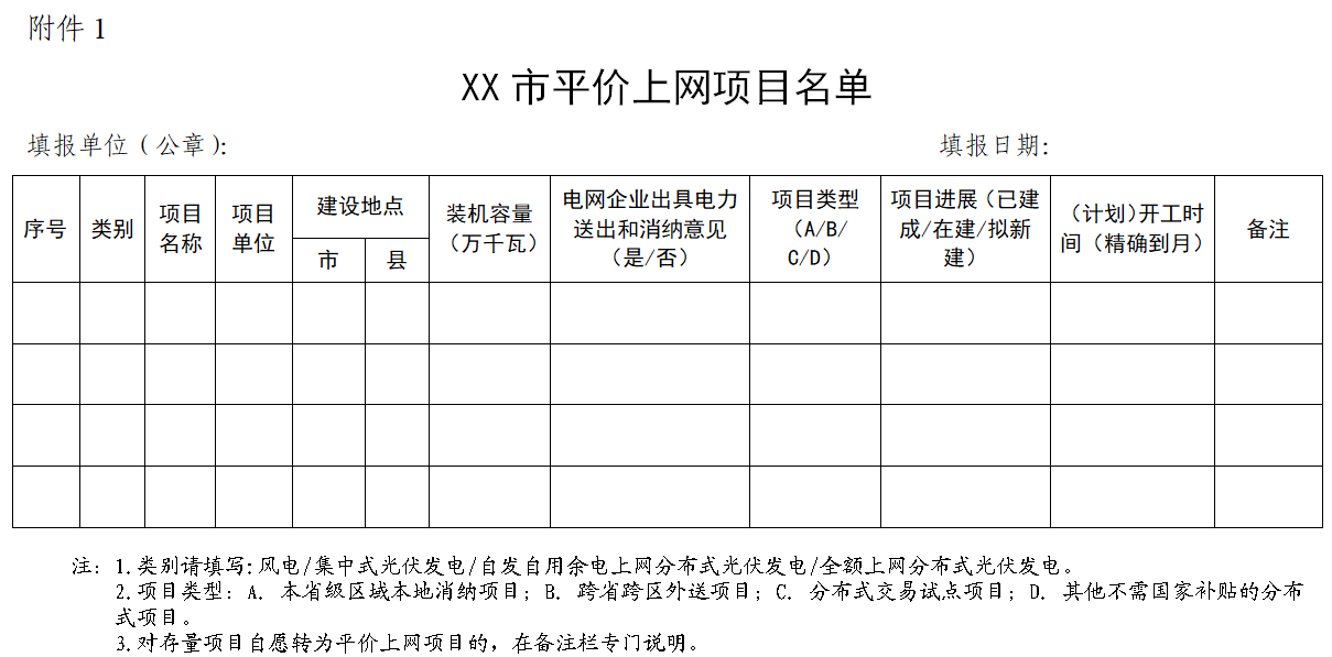 結(jié)合國家能源局《關(guān)于積極推進(jìn)風(fēng)電、光伏發(fā)電無補貼平價上網(wǎng)有關(guān)工作的通知》(發(fā)改能源〔2019〕19號),省發(fā)展改革委、省能源局《關(guān)于推進(jìn)風(fēng)電、光伏發(fā)電無補貼平價上網(wǎng)項目建設(shè)的通知》(魯發(fā)改能源〔2019〕367號)文件要求,各市在落實土地(場地)、規(guī)劃選址、避讓生態(tài)保護(hù)紅線、電力送出和消納等各項建設(shè)條件的基礎(chǔ)上,積極推進(jìn)無補貼平價上網(wǎng)風(fēng)電、光伏發(fā)電項目建設(shè)。新增項目必須在2020年底前能夠核準(zhǔn)(備案)且開工建設(shè)。國家2019年公布第一批平價上網(wǎng)項目后,本文件印發(fā)之前,各市按程序已自行組織實施的平價風(fēng)電和光伏發(fā)電項目,此次請一并報送。對暫不具備電力接入和消納條件的項目,各市要與“十四五”可再生能源發(fā)展規(guī)劃進(jìn)行有效銜接,有序推進(jìn)項目建設(shè)。請各有關(guān)市能源主管部門填寫平價上網(wǎng)項目名單(附件1),并于2020年4月20日前蓋章反饋省能源局。
