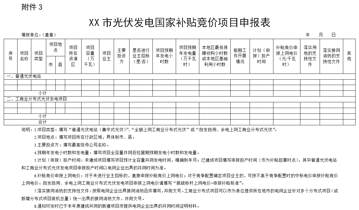 (四)項目提報。請各市能源主管部門在認(rèn)真組織項目業(yè)主競爭配置和嚴(yán)格審核項目名單、申報材料的基礎(chǔ)上,于6月5日前以正式文件將申報材料報省能源局,材料主要包括正式報告、光伏發(fā)電國家補貼競價項目申報表(附件3)、普通光伏電站支持性材料(按項目單獨裝訂成冊)。以上紙質(zhì)文件一式二份,并附電子版,逾期未報將不予受理。