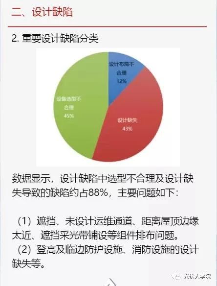 在設(shè)計缺陷中,選型不合理、設(shè)計缺失,兩者導(dǎo)致的缺陷約占88%。諸如:遮擋、未設(shè)計運維通道、距離屋頂邊緣太近、遮擋采光帶鋪設(shè)等組件排不問題;登高及臨邊防護(hù)設(shè)施、消防設(shè)施的設(shè)計缺失等。