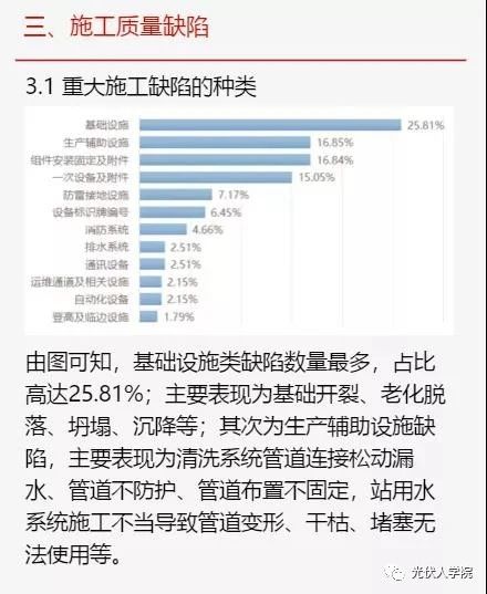 在重大施工缺陷中,基礎(chǔ)設(shè)施類缺陷數(shù)量最多,占比高達(dá)25.81%,其次為成產(chǎn)輔助設(shè)施缺陷。前者主要表現(xiàn)為基礎(chǔ)開裂、老化脫落、坍塌、沉降等;后者主要表現(xiàn)為連接松動漏水、管道不防護(hù)等。而通訊設(shè)備缺陷造成事故(或引發(fā)考核)的比例最高,達(dá)到42.86%。