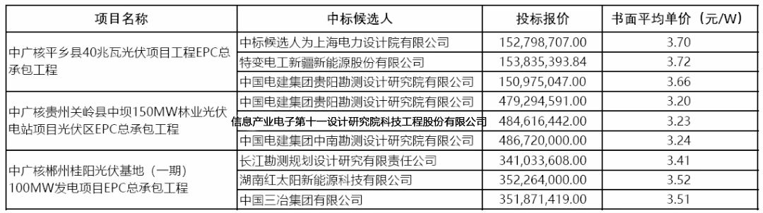 中廣核貴州關(guān)嶺縣中壩150MW林業(yè)光伏電站項(xiàng)目光伏區(qū)EPC總承包工程,中標(biāo)候選人為中國(guó)電建集團(tuán)貴陽(yáng)勘測(cè)設(shè)計(jì)研究院有限公司(投標(biāo)報(bào)價(jià)479,294,591.00)、信息產(chǎn)業(yè)電子第十一設(shè)計(jì)研究院科技工程股份有限公司(投標(biāo)報(bào)價(jià)484,616,442.00)、中國(guó)電建集團(tuán)中南勘測(cè)設(shè)計(jì)研究院有限公司(投標(biāo)報(bào)價(jià)486,720,000.00),書面最高單價(jià)為3.24元/W,最低3.20元/W。最終中國(guó)電建集團(tuán)貴陽(yáng)勘測(cè)設(shè)計(jì)研究院有限公司拿下該項(xiàng)目。