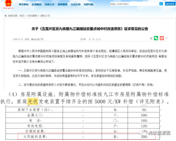 2018年,江西九江市濂溪區(qū)下發(fā)了關(guān)于《五里片區(qū)安九鐵路九江編組站安置點城中村改造項目》征求意見的公告,文件中提及關(guān)于家庭光伏方面的拆遷費用為5000元/千瓦,人工費用為300元/套。