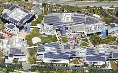 谷歌總部新辦公大樓、停車棚上都安裝了光伏電站,被太陽能電池板覆蓋的谷歌總部,宛如一片藍色海洋,到處都是太陽能的足跡。