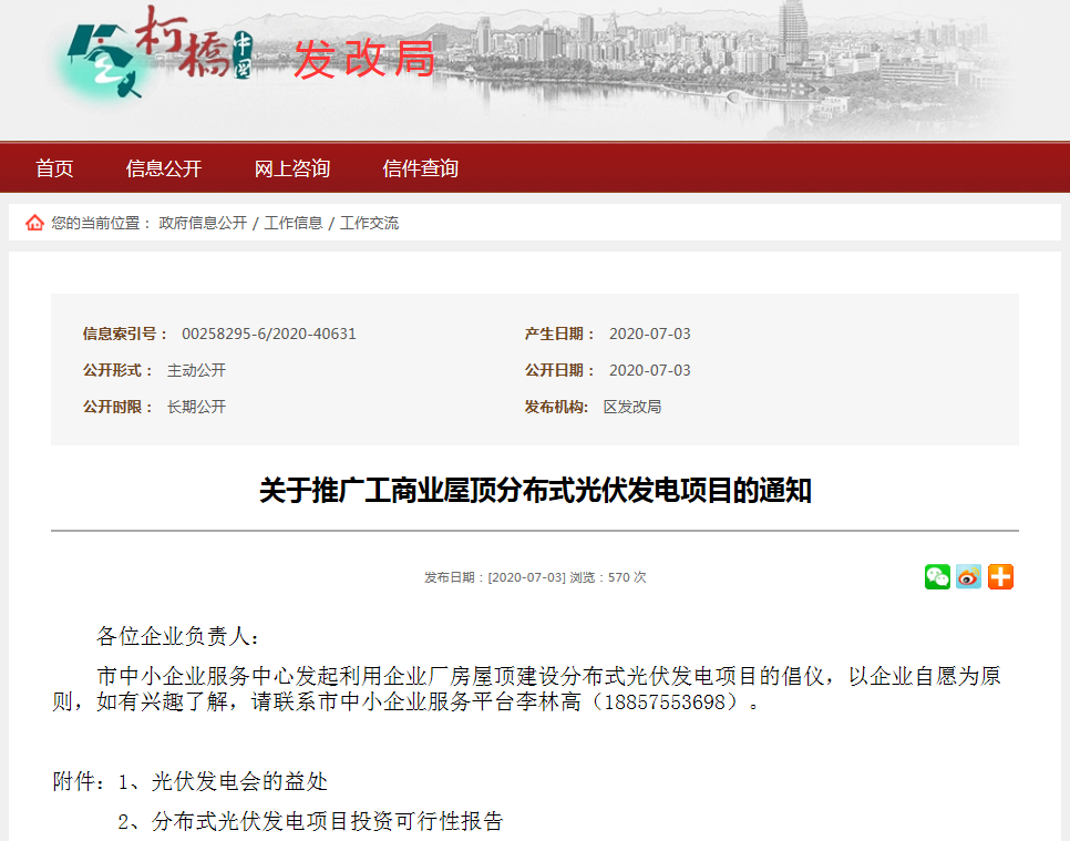 去年,浙江紹興政府發(fā)改局的官網(wǎng)上發(fā)布了《關(guān)于推廣工商業(yè)屋頂分布式光伏發(fā)電項目的通知》,推薦當?shù)刂行∑髽I(yè)利用企業(yè)廠房屋頂建設(shè)分布式光伏發(fā)電項目,并宣傳光伏發(fā)電的益處。