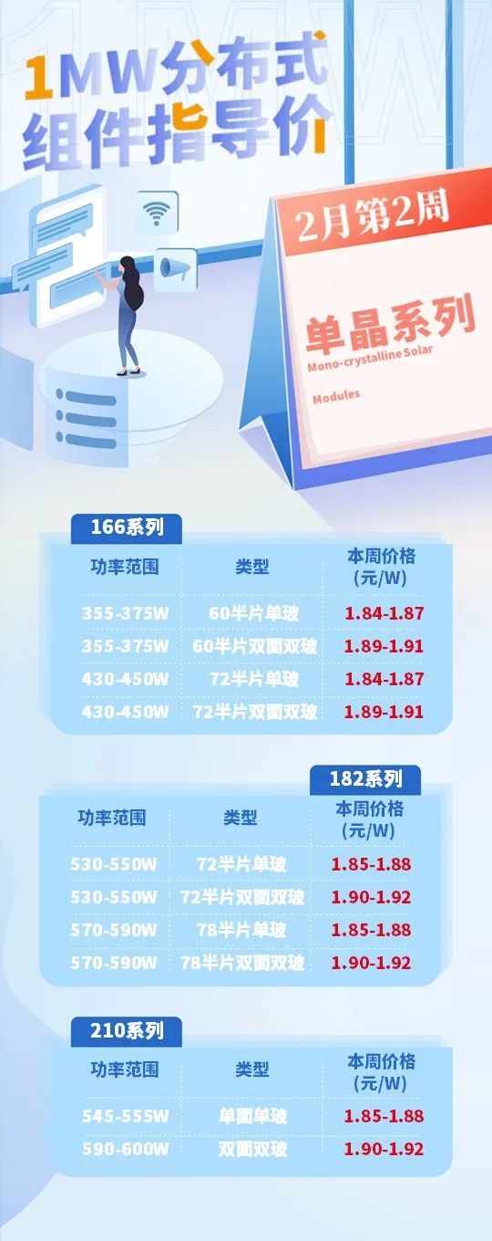 光伏盒子終端市場(chǎng)分析組根據(jù)終端統(tǒng)計(jì)的分布式市場(chǎng)組件成交2022年2月第2周的指導(dǎo)價(jià)如下: