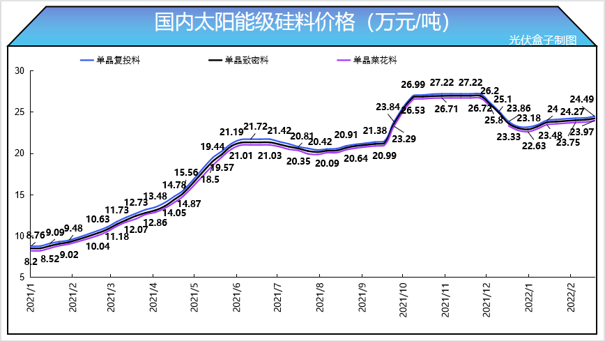 國內(nèi)單晶復(fù)投料價(jià)格區(qū)間在242-249元/kg,成交均價(jià)為246.2元/kg;單晶致密料價(jià)格區(qū)間在240-247元/kg,成交均價(jià)為243.6元/kg;單晶菜花料價(jià)格區(qū)間在238-244元/kg,成交均價(jià)為240.9元/kg。