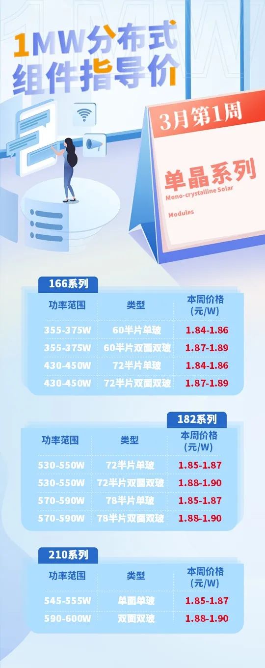 光伏盒子光伏下游市場分析組根據(jù)終端統(tǒng)計(jì)的分布式市場組件成交價(jià)情況,綜合整理得出的2022年3月第1周的指導(dǎo)價(jià)如下: