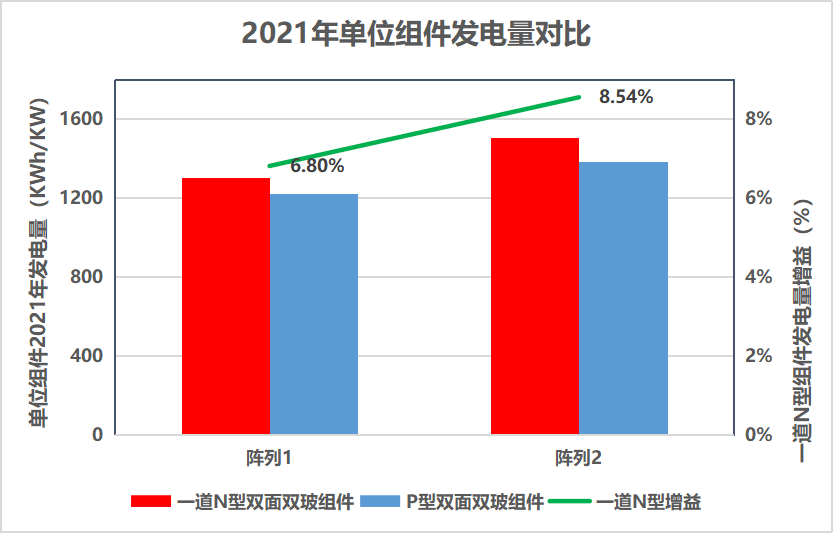 一道新能N型高效組件項(xiàng)目傳來喜訊,其在2020年11月采用N型雙面雙玻組件的青海格爾木烏圖美仁光伏項(xiàng)目,于2020年12月底并網(wǎng),經(jīng)過一年多時(shí)間的運(yùn)行,一道新能N型高效組件的發(fā)電優(yōu)勢很快凸顯了出來。本文選取了兩個(gè)系統(tǒng)設(shè)計(jì)和安裝環(huán)境完全相同的組件陣列做對比,可以看出2021年度單位千瓦一道N型雙面雙玻組件發(fā)電量比同等情況下的P型雙面雙玻組件分別高了6.8%和8.54%,發(fā)電性能優(yōu)異,大幅提升了光伏電站的營收和系統(tǒng)收益率。