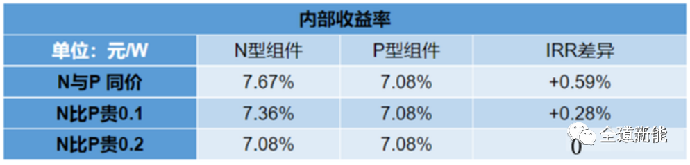 已知N型組件比P型組件存在0.2元/W的溢價(jià),也就是說,N型組件比P型組件貴0.2元/W時(shí),仍能保持相同的內(nèi)部收益率,0.1元/W的價(jià)差仍為光伏系統(tǒng)提供了降本的空間。