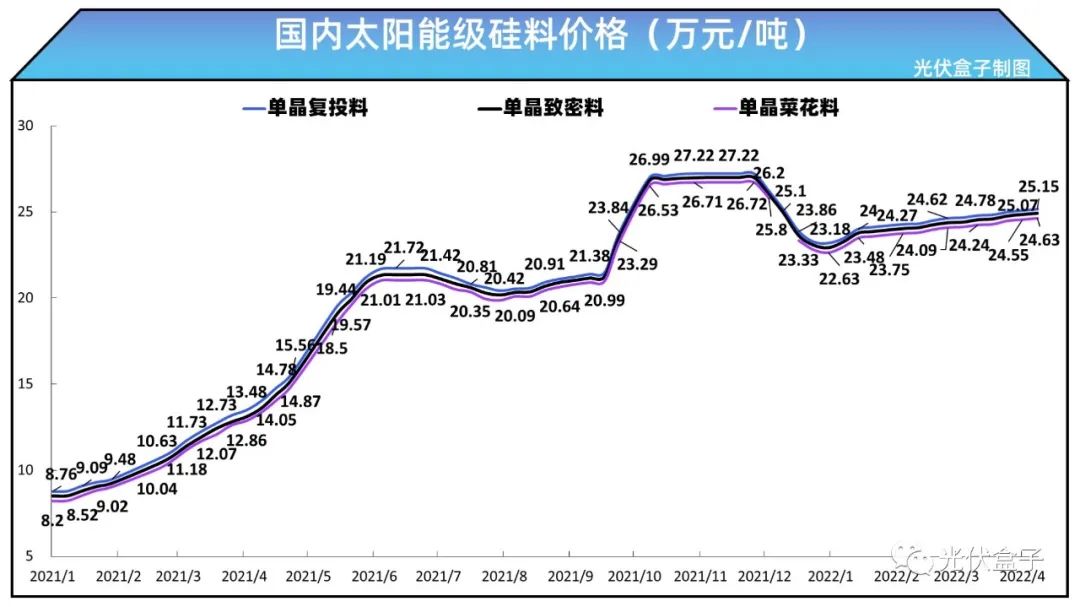 統(tǒng)計(jì),本周國(guó)內(nèi)單晶復(fù)投料價(jià)格區(qū)間在24.9-25.9萬(wàn)元/噸,成交均價(jià)上漲至25.33萬(wàn)元/噸,單晶致密料價(jià)格區(qū)間在24.7-25.7萬(wàn)元/噸,成交均價(jià)上漲至25萬(wàn)元/噸,硅料已經(jīng)連漲14周了。