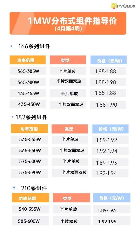 本周分布式組件166單面組件1.85-1.88元/W,單晶182和210單面1.89-1.92元/W,單晶182和210雙面1.92-1.95元/W。光伏盒子光伏下游市場(chǎng)分析組根據(jù)終端統(tǒng)計(jì)的分布式市場(chǎng)組件成交價(jià)情況,綜合整理得出的2022年4月第4周的指導(dǎo)價(jià)如下: