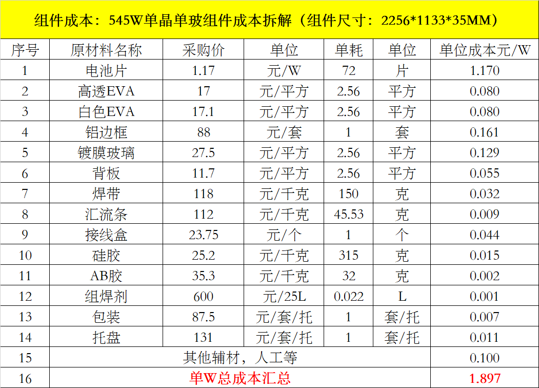 但是目前光伏產(chǎn)業(yè)鏈硅料環(huán)節(jié)利潤(rùn)占比超過整個(gè)行業(yè)利潤(rùn)的50%,下游一些組件廠還在虧本,真的太難了,光伏組件材料成本都1.897元/W了,組件賣1.9元/W還貴嗎?為了讓更多的人了解現(xiàn)在組件的真實(shí)情況,故光伏盒子小編制作了組件成本拆解表供大家參考,如下: