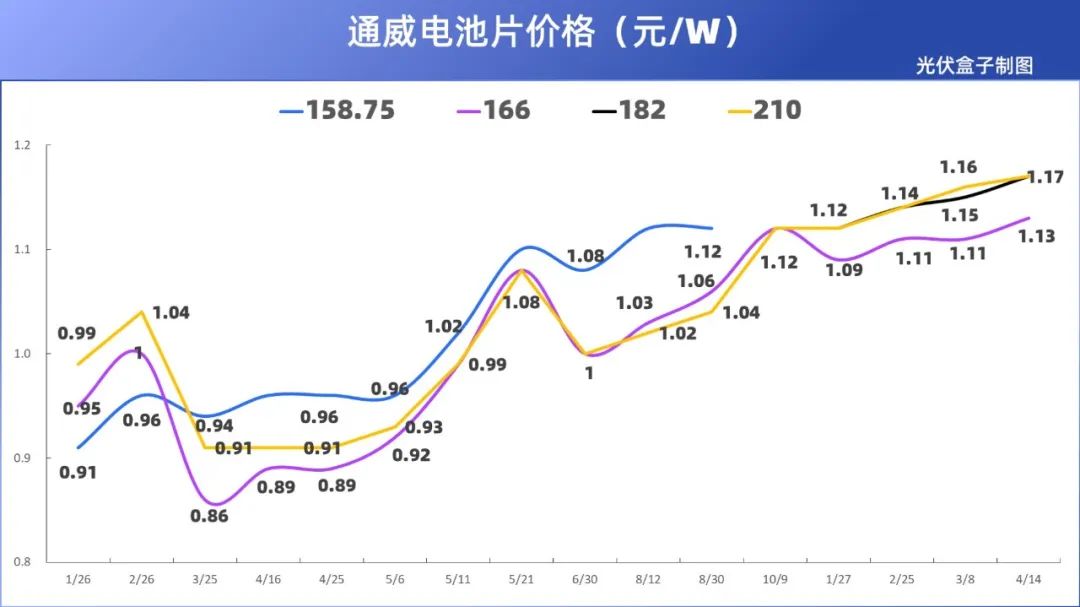 本周M6電池片報(bào)價(jià)1.13元/W、M10電池片報(bào)價(jià)1.17元/W、G12電池片報(bào)價(jià)1.17元/W。
