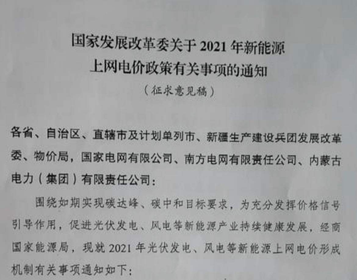 重磅!國家發(fā)改委就2021年光伏、風電上網(wǎng)電價征求意見:指導電價出爐、戶用3分